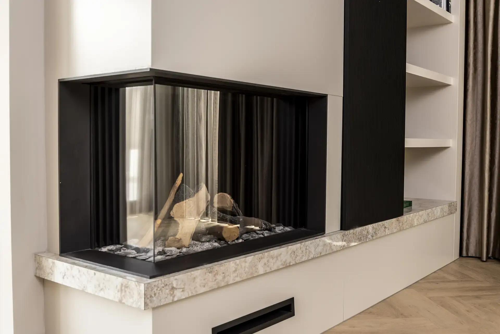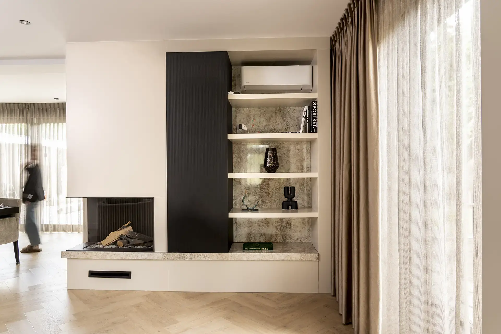 In dit hele interieur is gewerkt vanuit de beschikbare ruimte en de bijzondere karakteristieken van ramen, gebruiksruimten en manoeuvreerruimte. Door middel van een strategisch verlichtingsplan en zorgvuldig geselecteerde vloer- en raambekleding, wordt de sfeer in dit exclusieve designinterieur nog eens extra benadrukt.