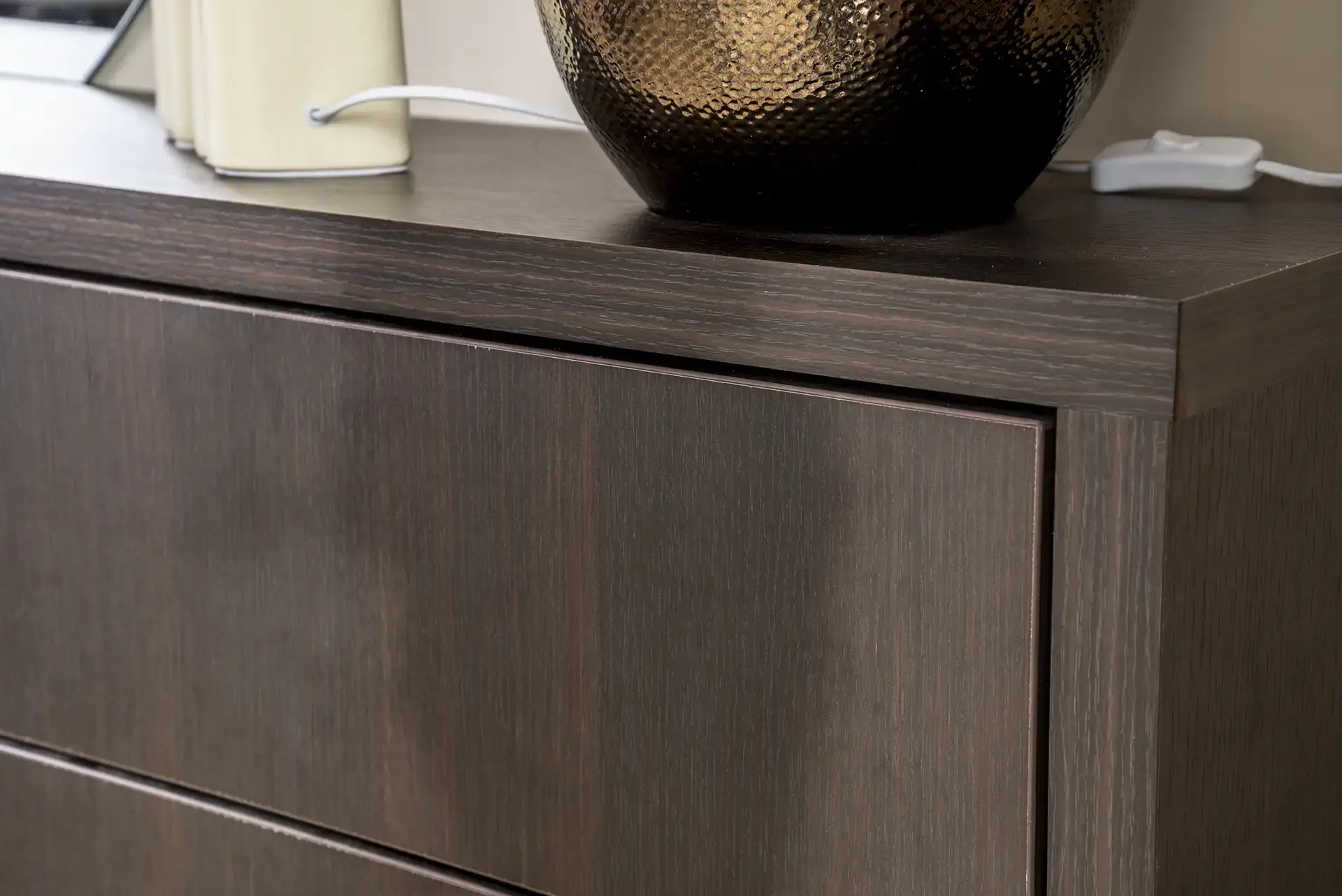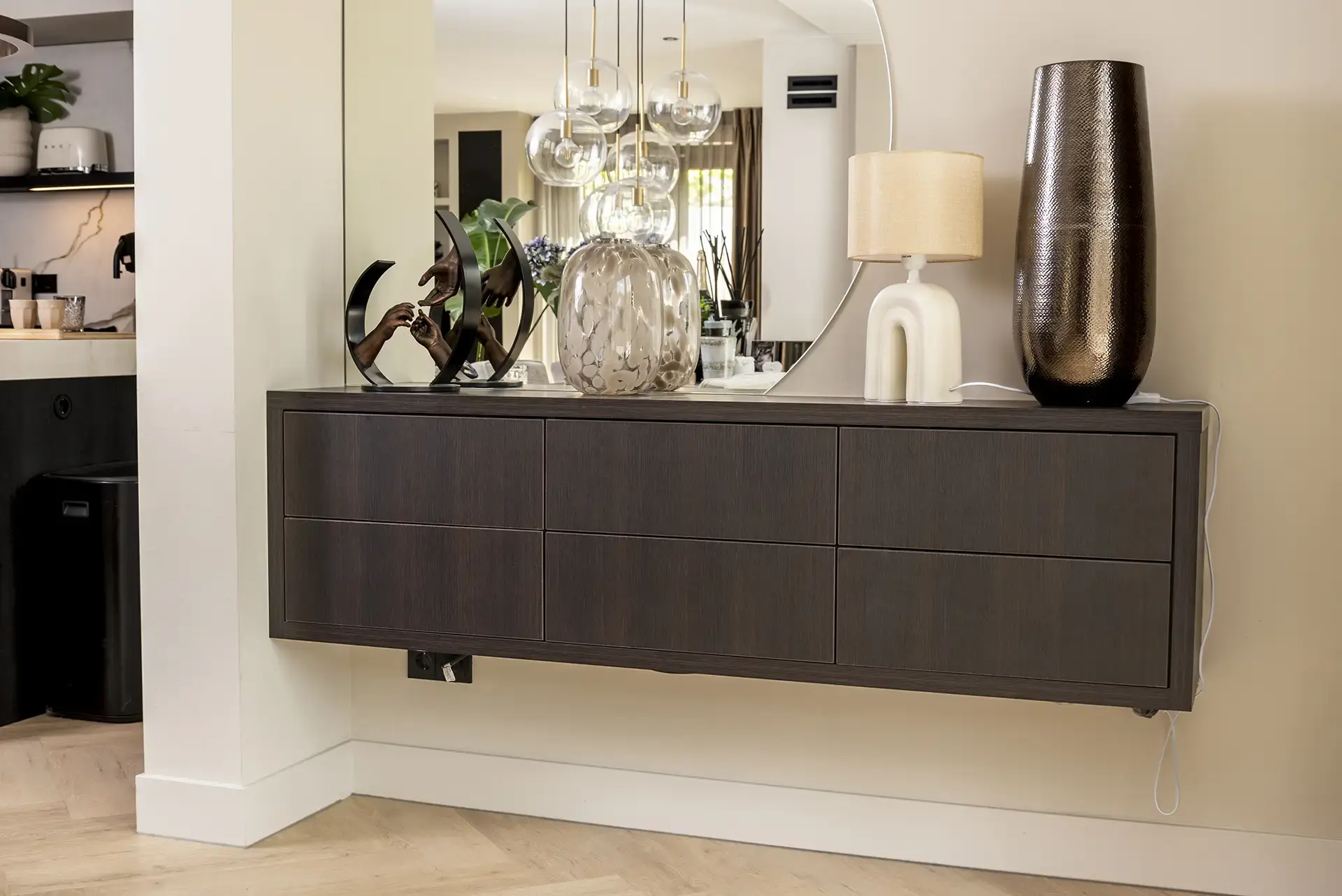 De laatste ruimte die Van Vugt Meubel- en Interieurbouw onder handen heeft genomen, is de eerste bij binnenkomst: de entree. Deze plek biedt met een zwevend dressoir met zes ruime lades een mooie balans in zowel functionaliteit als esthetiek; prachtig voor decoraties op het dressoir en de ideale oplossing voor het uit het zicht opbergen van allerlei items die bij thuiskomen en weggaan vanaf nu hun vaste plek hebben.