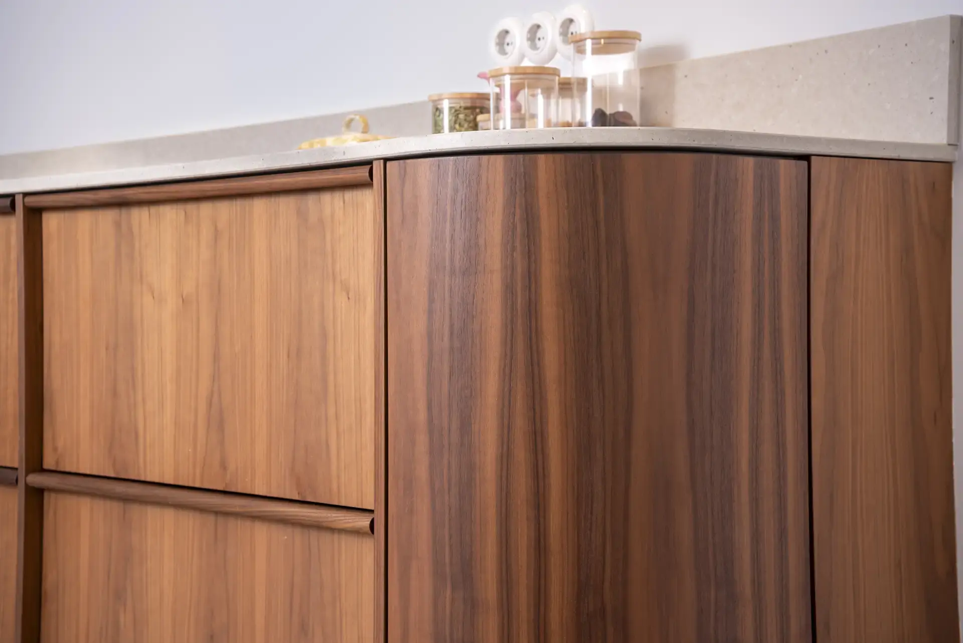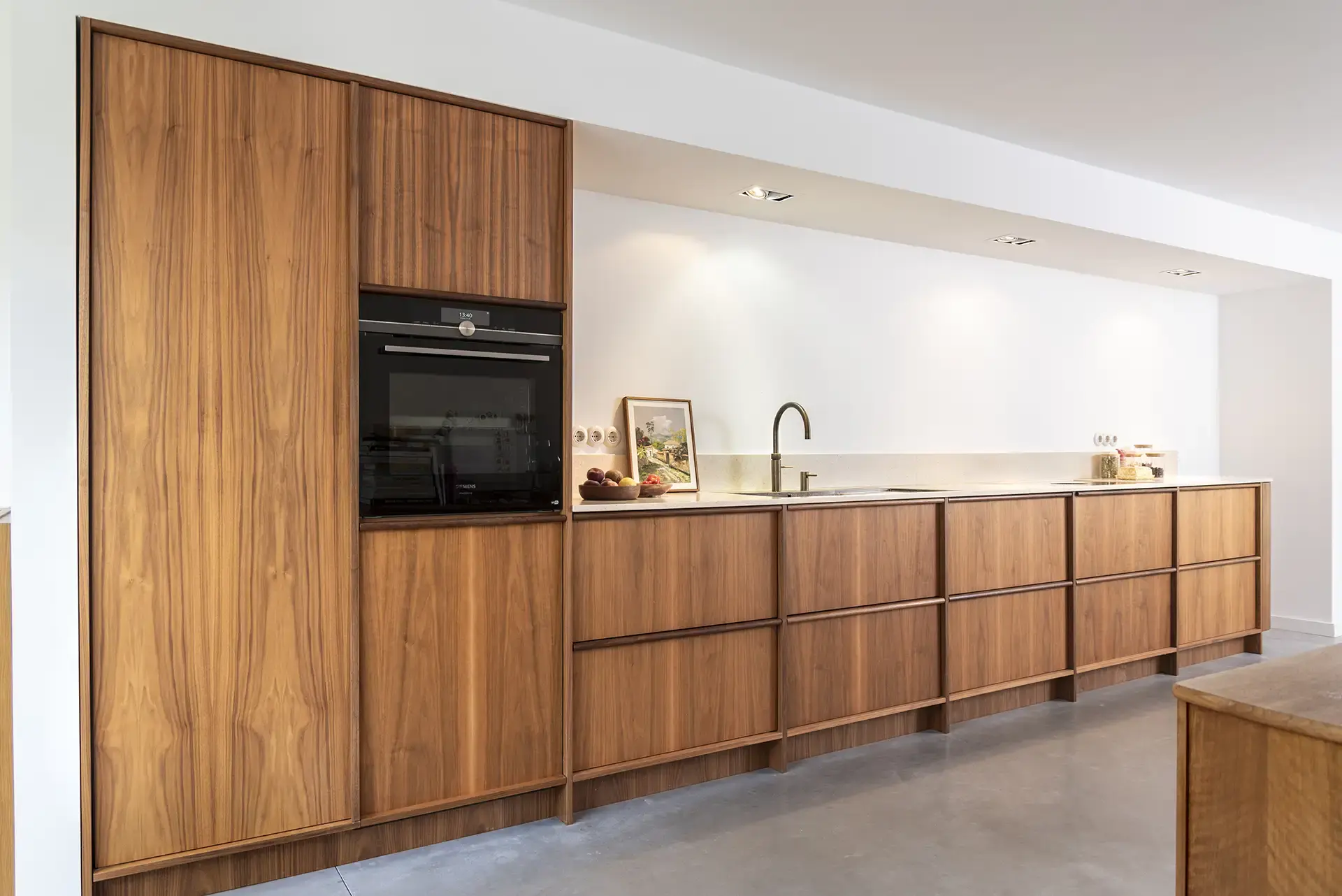 Om de hoogte van de ruimte te benutten, concentreert het maatwerk zich van de vloer tot aan het (verlaagd) plafond waarin de verlichting is weggewerkt. Door de Bora kookplaat met geïntegreerde afzuiging blijft het ontwerp van de keuken verder heerlijk clean en is het iedere dag weer een genot om in deze Japandi keuken te mogen koken. Ook voor de overige apparatuur is gekozen voor gerenommeerde merken die kwaliteit combineren met moderne functionaliteiten zoals: Siemens, StudioLine en Quooker.