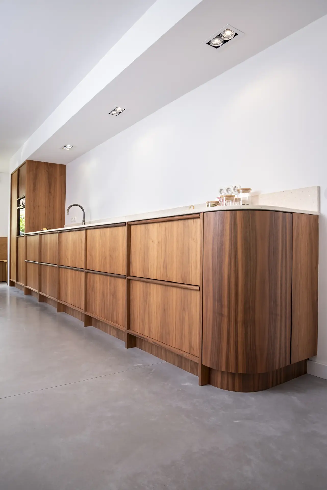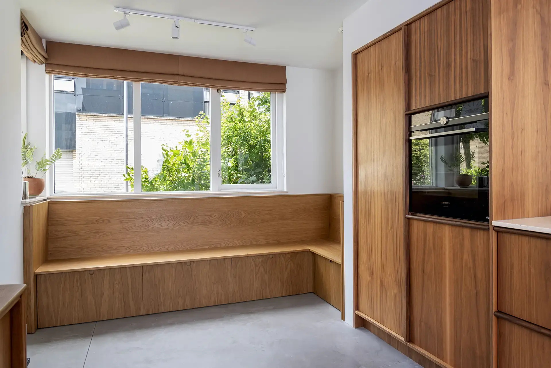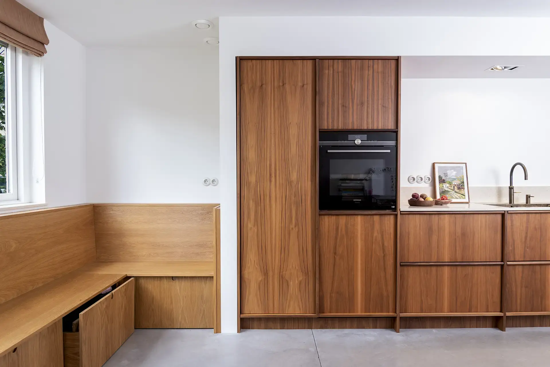 Links naast de hoge keukenkasten is in een nis onder het raam een maatwerk eiken zitbank gecreëerd. Met een rechte rugleuning en vier praktische lades creëert deze zitbank nog meer praktische opbergruimte; een bijzondere combinatie van een dubbele functie, comfort én stijl.