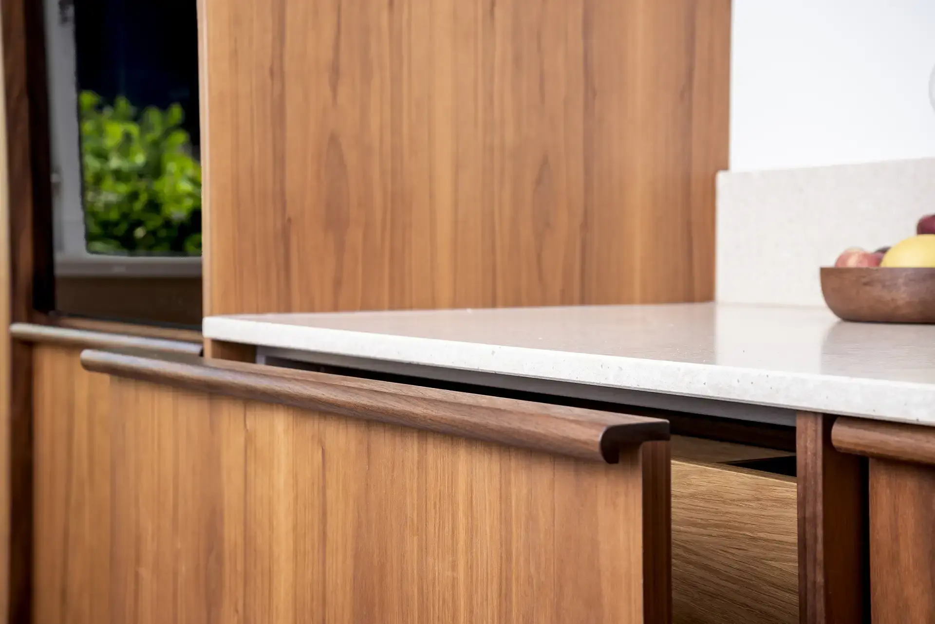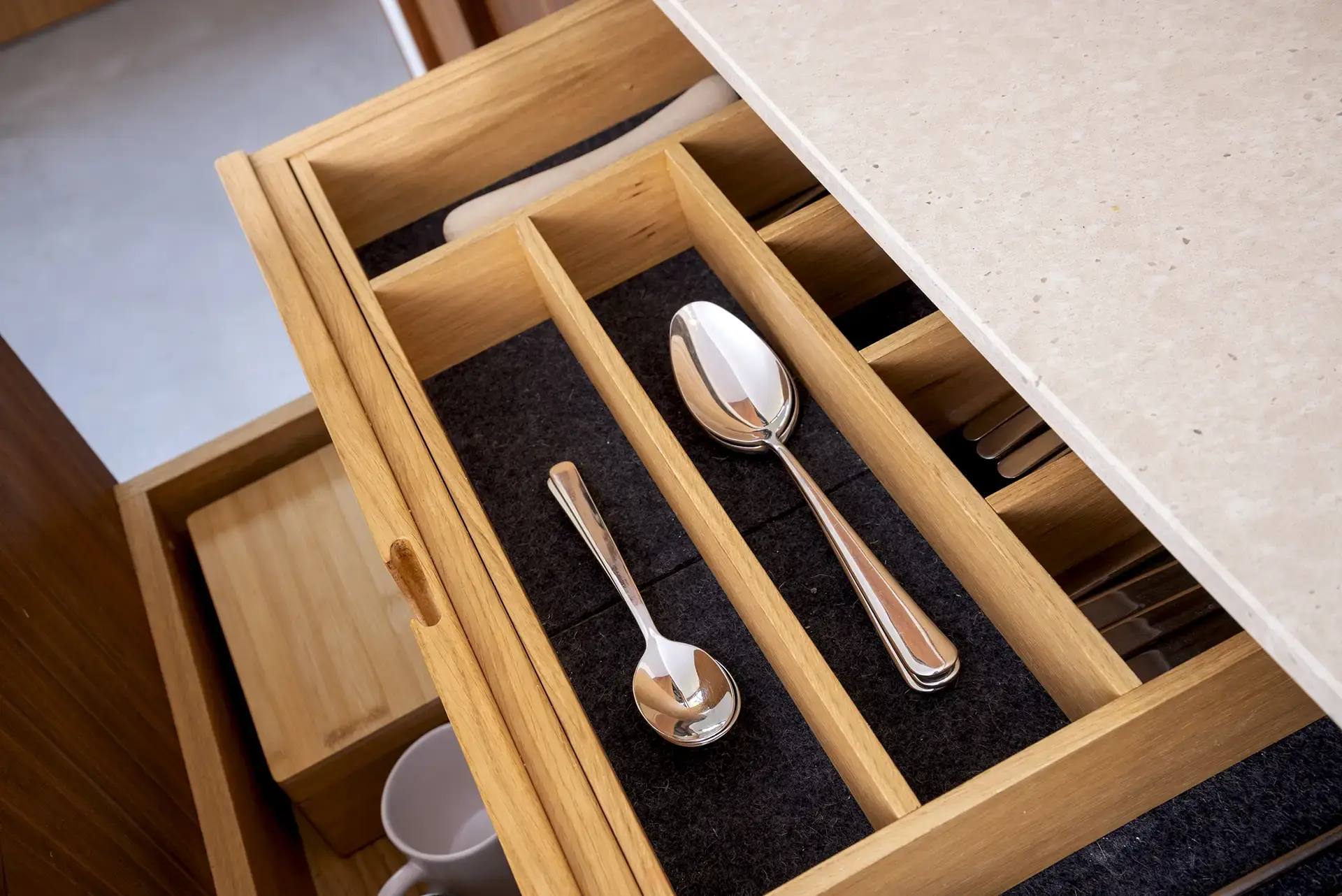 Ergonomische aspecten waaraan we tijdens het ontwerp en de uitvoering aandacht aan hebben besteed: de hoogte van het aanrecht, de plaatsing van de combi-oven in een hoge kast en de soepel te openen en sluiten grote lades en binnenlades die overzichtelijk hun inhoud tonen.