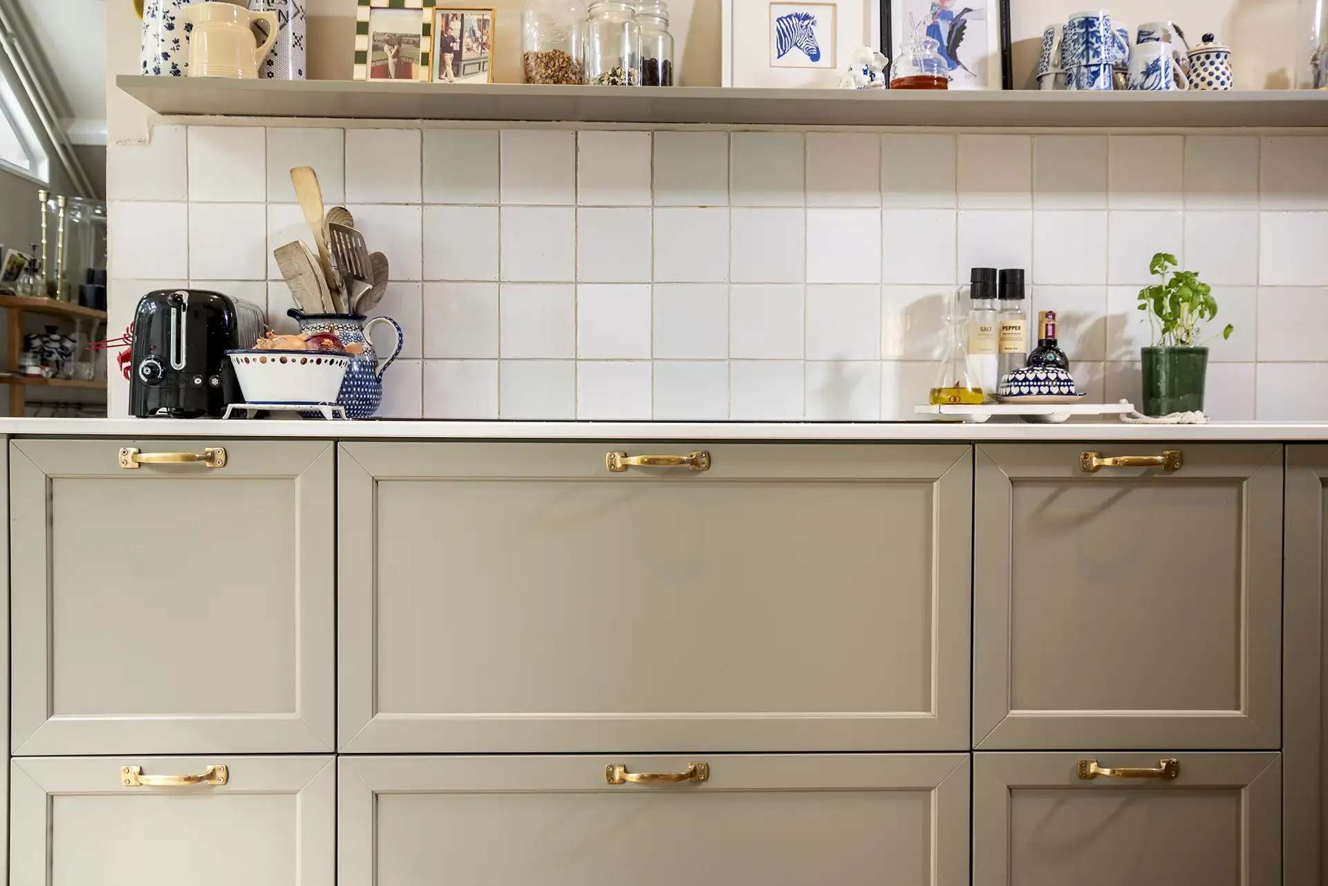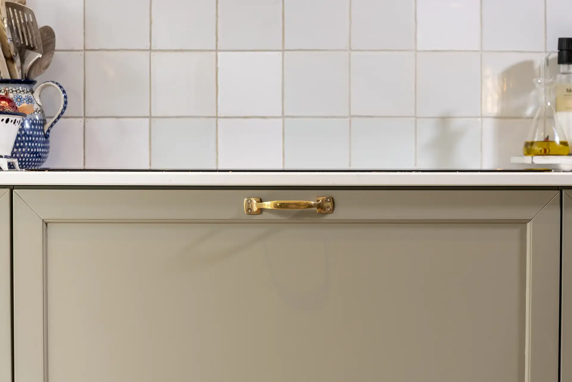 Het lange deel van de L-vormige keuken valt op door het witte dunne composiet aanrecht, de lichte grijsgroene kastfronten met messing handgrepen en de verschillende tinten witte en lichtgroene landelijke tegeltjes. Een enkele blinde plank boven het aanrecht geeft ruimte aan sfeervolle decoraties.
