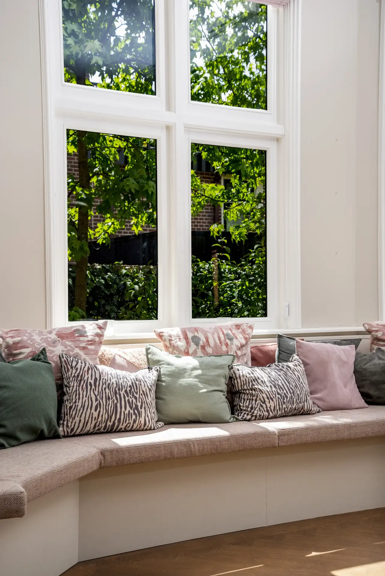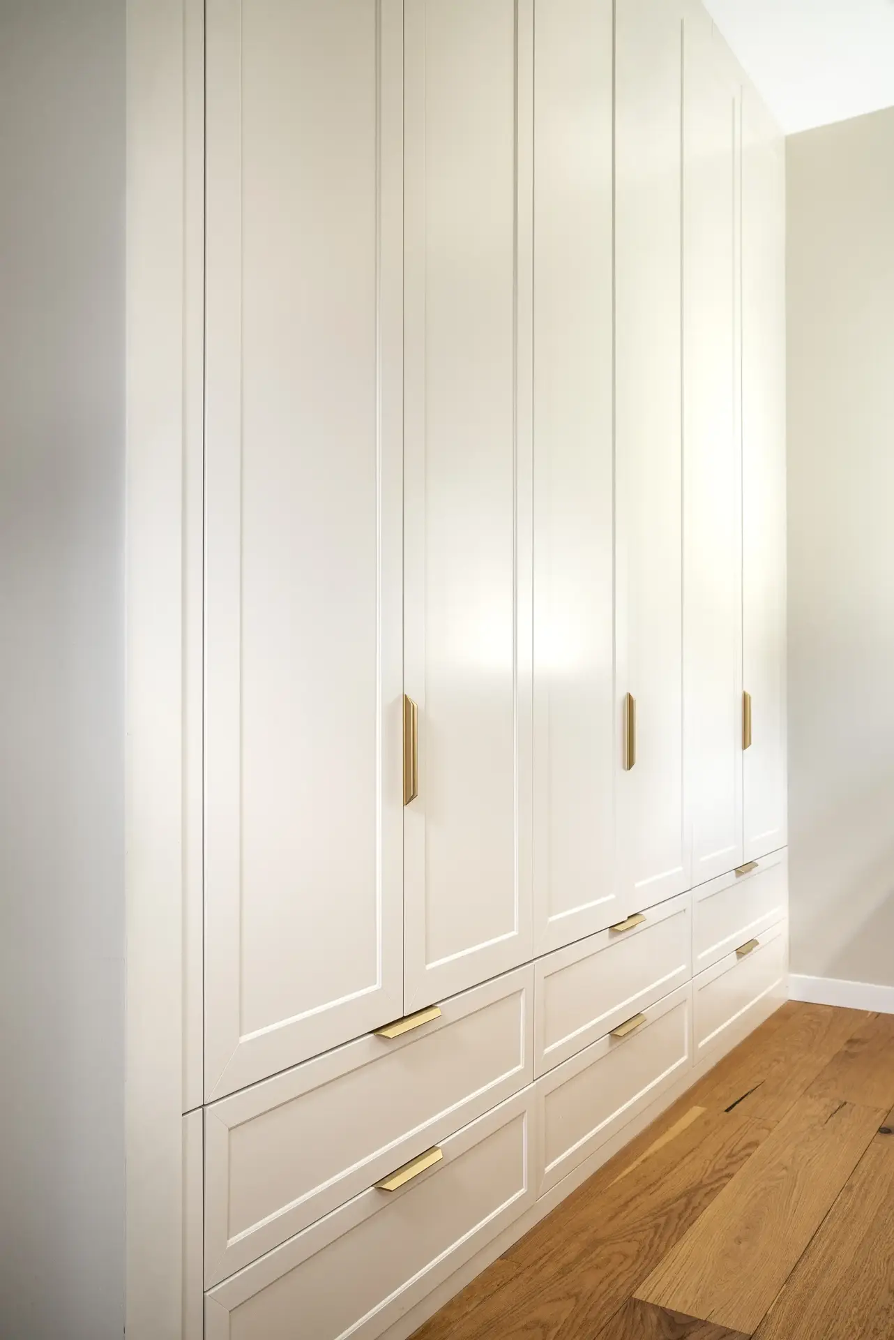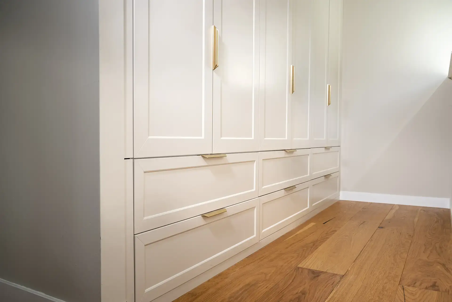 Wat heeft Van Vugt Meubel- en Interieurbouw nog meer voor dit fraai herenhuis mogen ontwerpen en realiseren? Een maatwerk kledingkast die over de volledige hoogte van de ruimte strekt; met drie dubbele kasten met messing handgrepen en zes flinke lades, alle kastfronten in krachtig wit voor rust en eenheid.