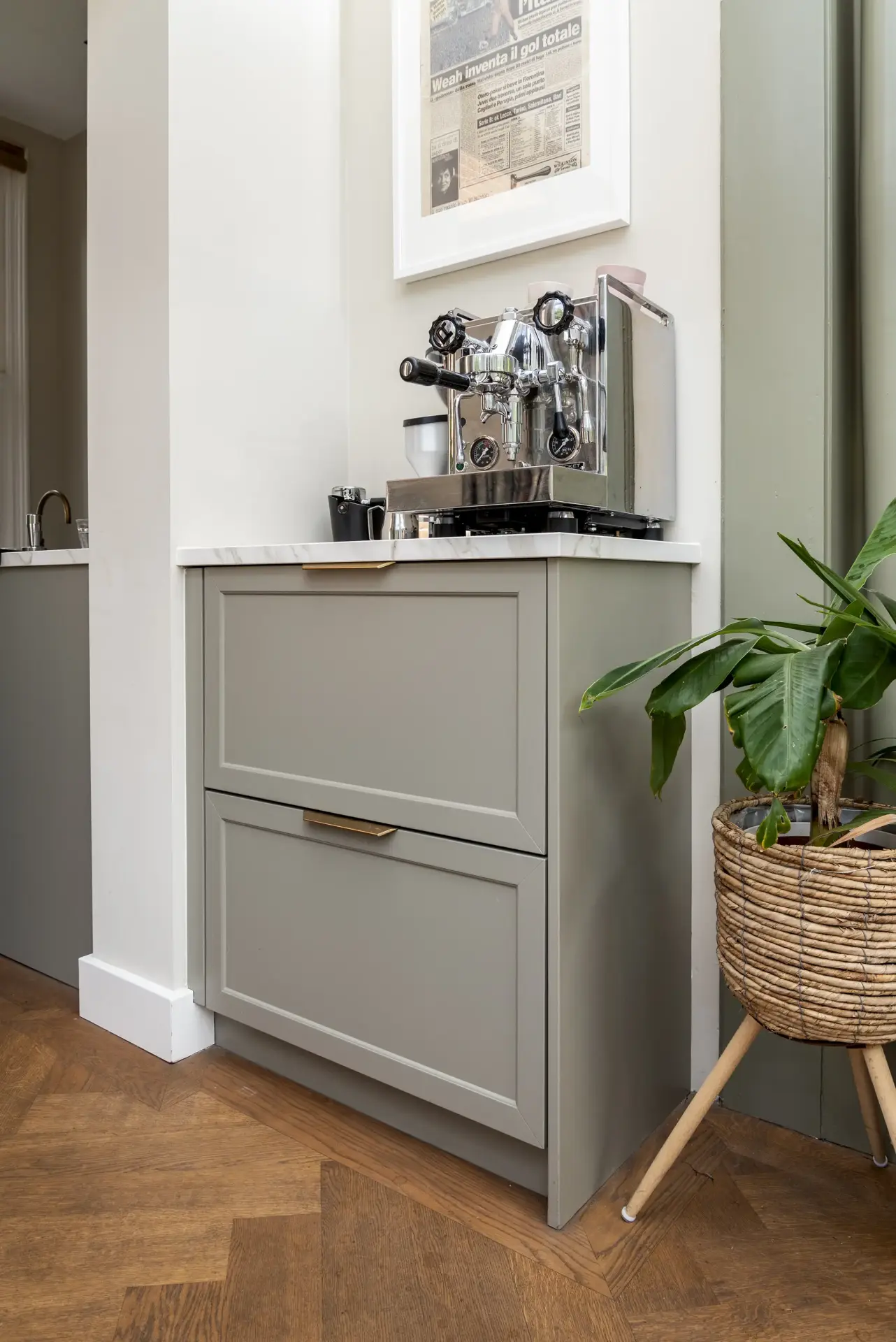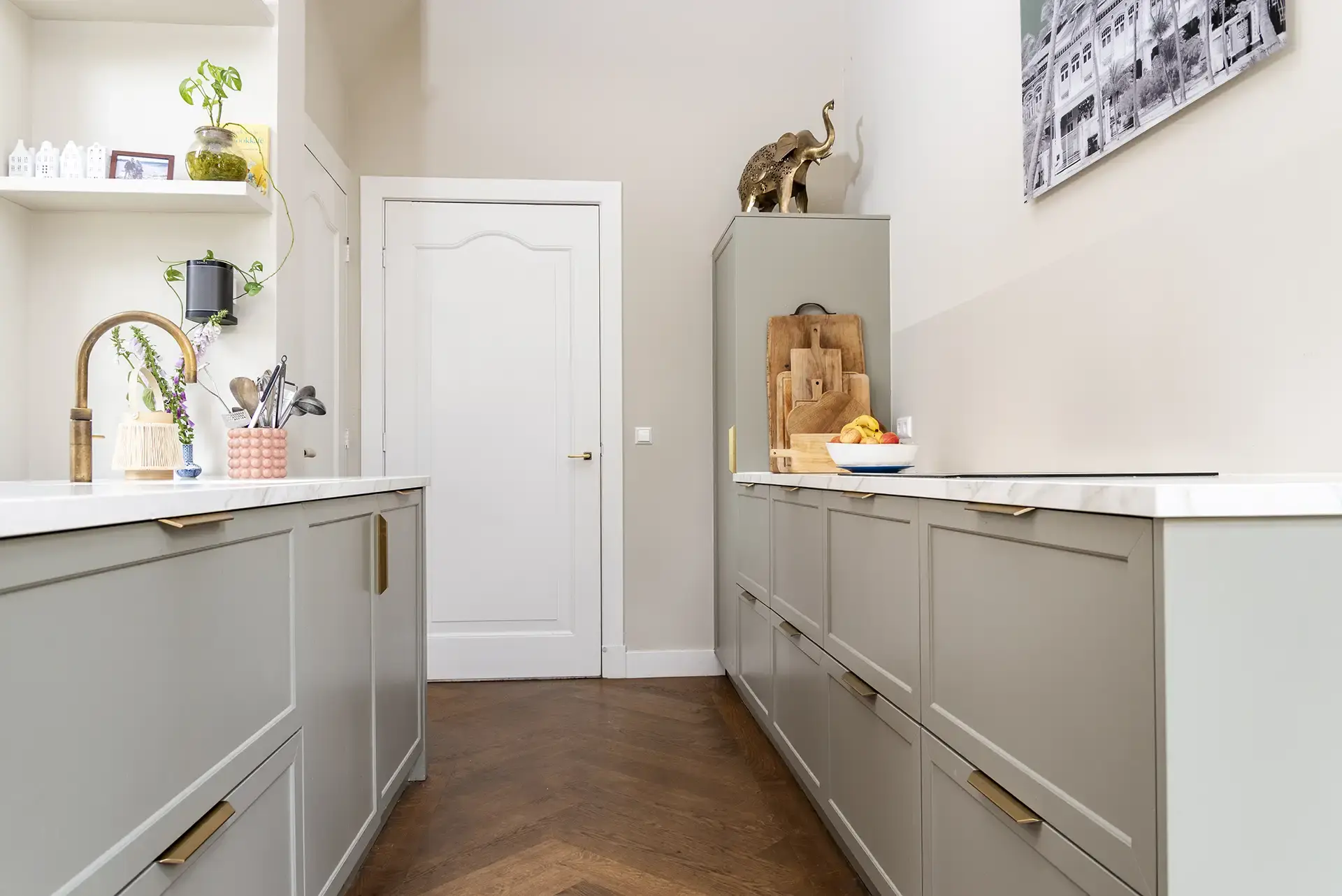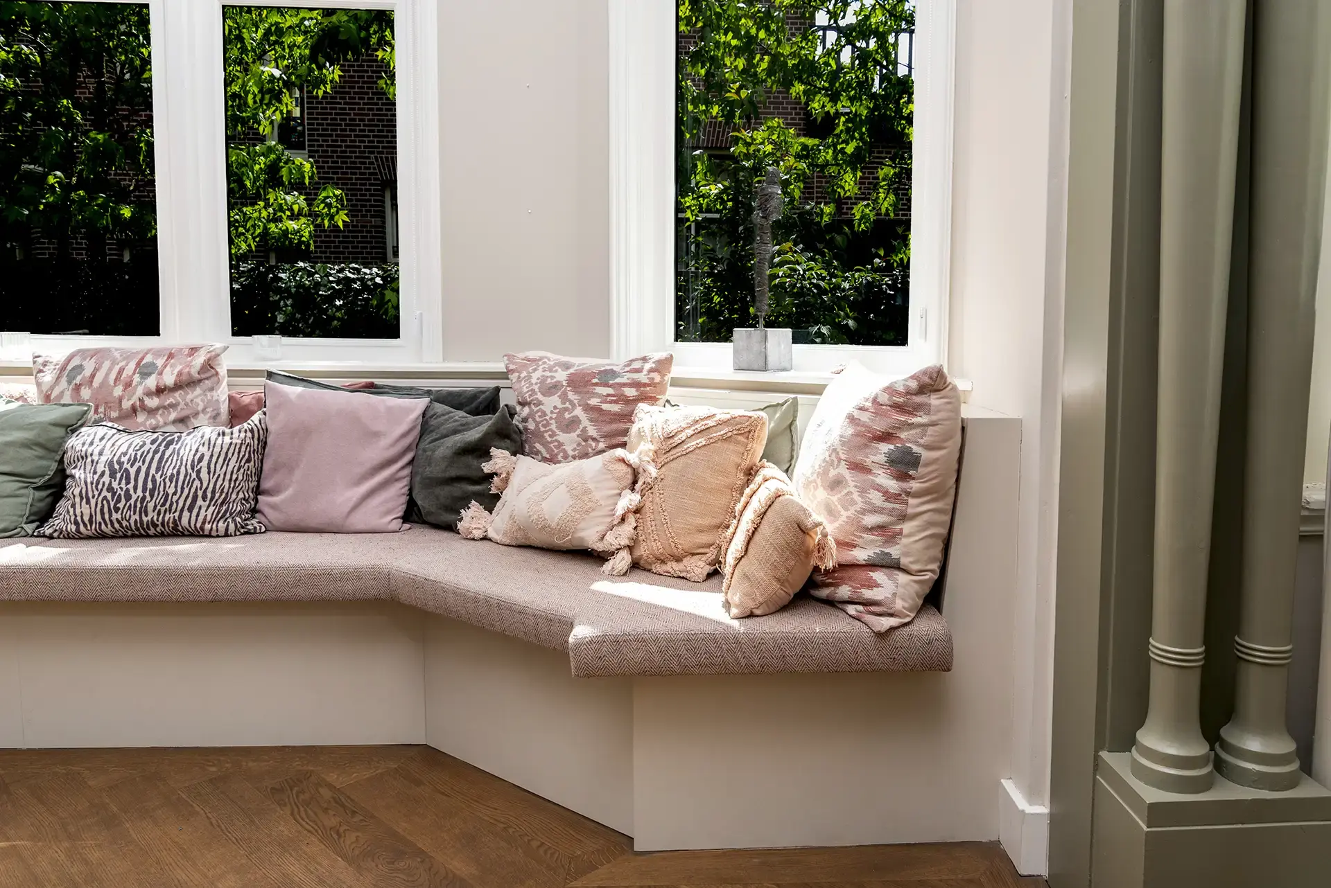 Wat heeft Van Vugt Meubel- en Interieurbouw nog meer voor dit fraai herenhuis mogen ontwerpen en realiseren? Een maatwerk kledingkast die over de volledige hoogte van de ruimte strekt; met drie dubbele kasten met messing handgrepen en zes flinke lades, alle kastfronten in krachtig wit voor rust en eenheid.