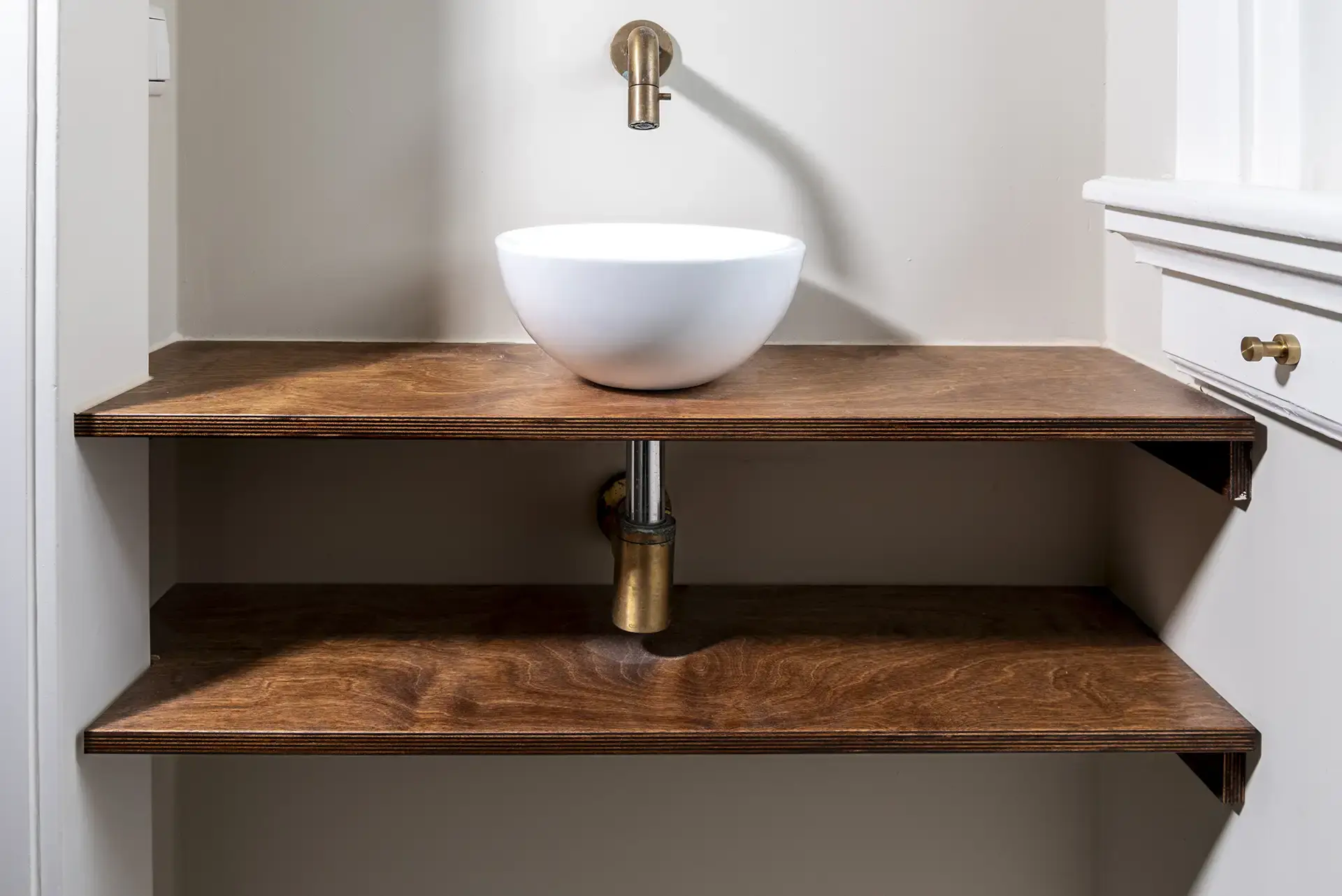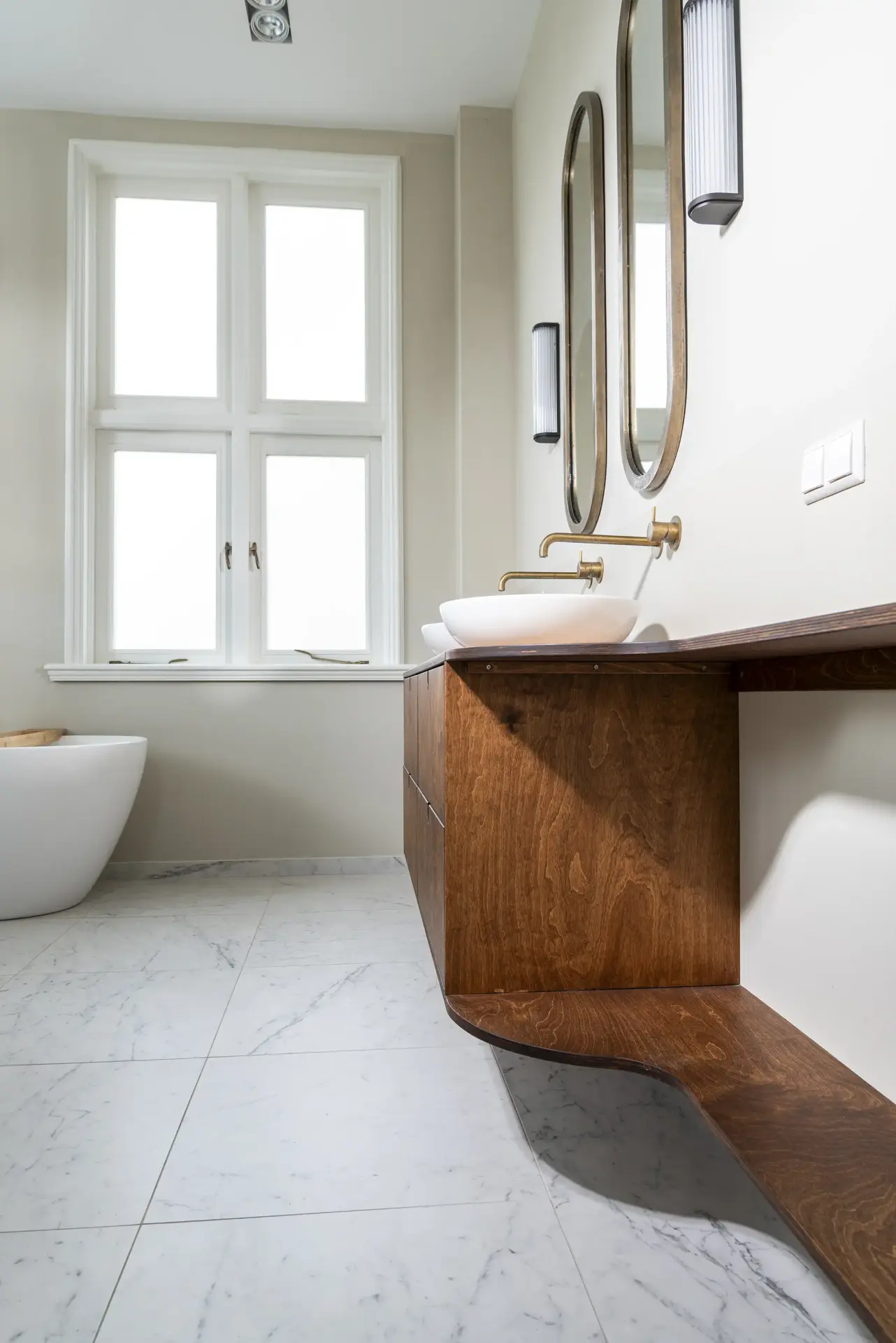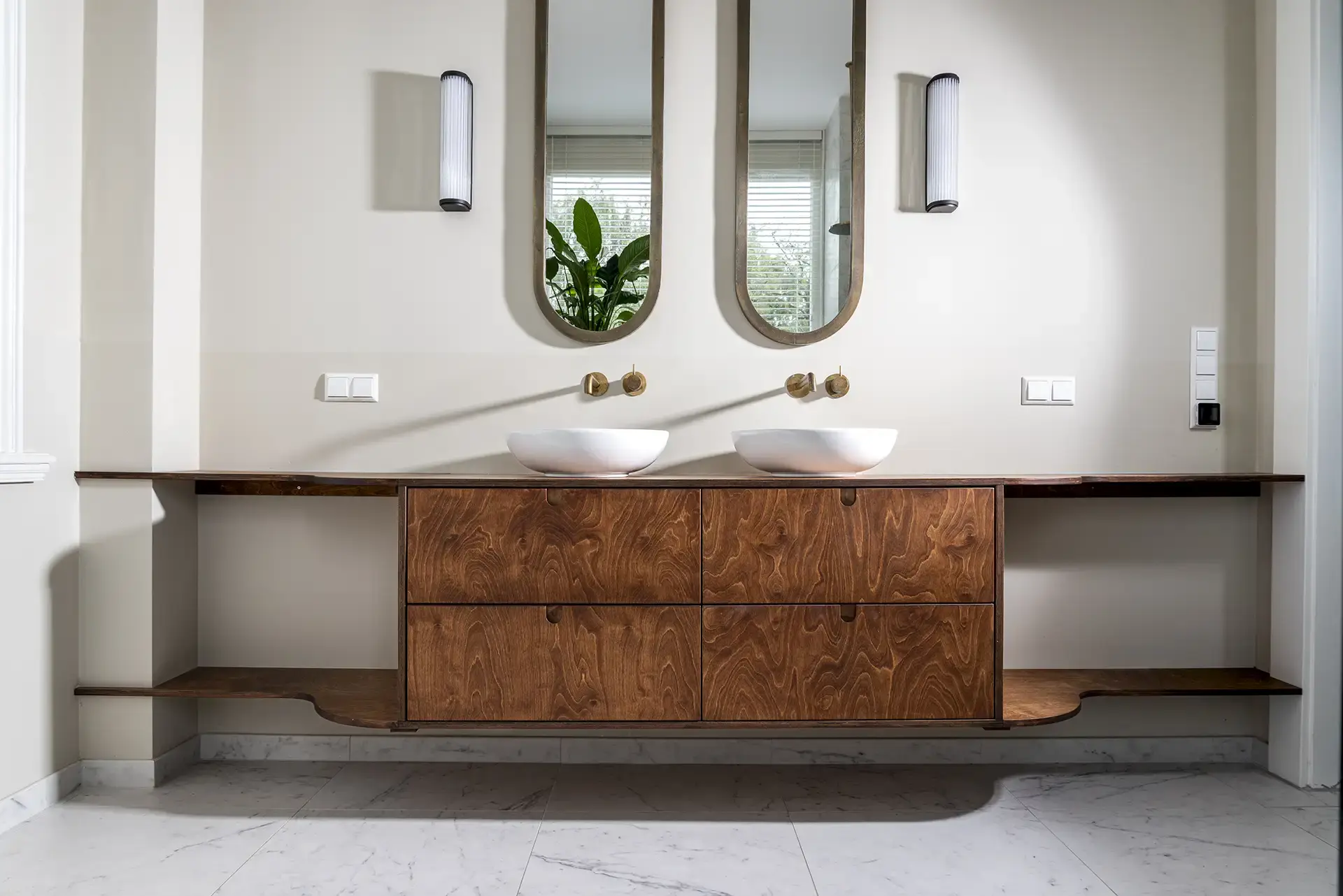 Bij de badkamer is symmetrie het centrale uitgangspunt van het ontwerp. Dit is te zien aan de plaatsing van het badkamermeubel in de ruimte en het werkblad dat rond de kolom aan de linkerzijde doorloopt. De badkamer heeft een retro look door de ronde vormen aan beide zijden van de vier lades en de speciaal geselecteerde attributen zoals spiegels en wandverlichting. Het badmeubel heeft een unieke diepbruine houtprint en de karakteristieke tekening in het hout loopt van de bovenste lade door in de onderste lade. Dit zorgt niet alleen voor een harmonieuze samenhang, maar ook voor een spannend design. De witte waskommen met messing inbouwkranen geven vervolgens een bijzonder contrast met de overige materialen en kleuren in deze badkamer. Het toiletmeubel is geheel in dezelfde stijl als het badkamermeubel uitgevoerd.